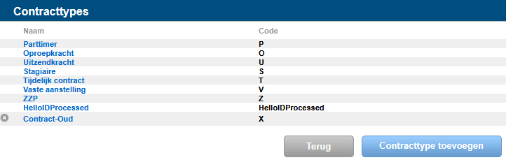 Het scherm toont de ingerichte contracttypes. Gearchiveerde contracttypes zijn herkenbaar via een grijze signalering met een wit kruisje.