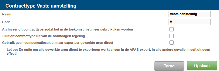 Geef het contracttype een herkenbare naam. Deze naam wordt weergegeven in de keuzelijst Contracttype bij de contractgegevens van de medewerker.