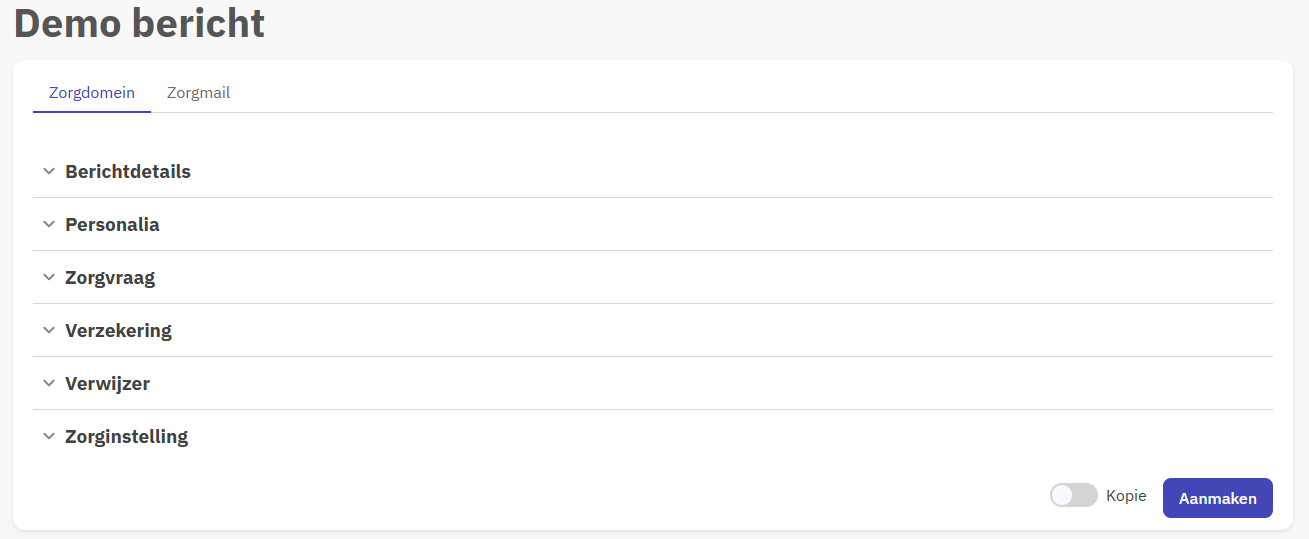 Demo bericht: hier is het mogelijk om testverwijzingen naar de inbox te versturen. Deze functionaliteit is alleen beschikbaar op testomgevingen. Meer uitleg is te vinden onder het kopje Demoverwijzingen verderop in deze handleiding.