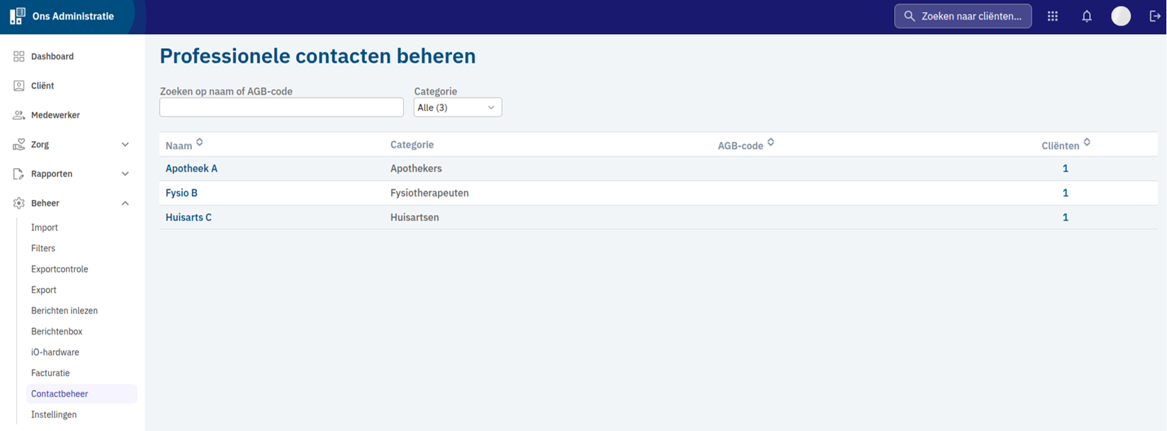 - sorteren op de kolommen naam, AGB-code en cliënten
